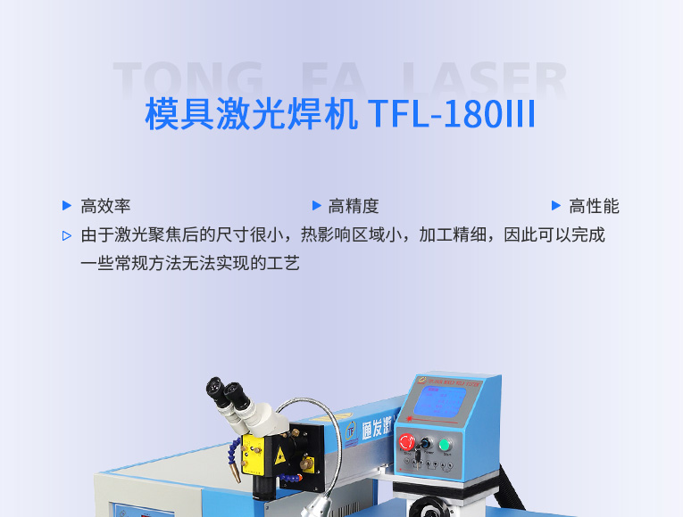 普通型模具激光焊機(jī)TFL-180Ⅲ是通發(fā)激光公司的模具激光焊機(jī)中銷(xiāo)量較大的傳統(tǒng)型,配置激光頭手搖升降與工作臺(tái)按鈕電動(dòng)升降實(shí)現(xiàn)焊接不同厚度模具的激光焊加工。本系列機(jī)型適用于各類(lèi)精密注塑模具激光補(bǔ)焊、壓鑄模具激光修補(bǔ)焊接;同時(shí)也適合鑄件沙孔激光修補(bǔ)、模具磨損激光修復(fù)、過(guò)切加工等的激光修補(bǔ);各類(lèi)金屬結(jié)構(gòu)件激光焊接加工、金銀首飾激光焊接加工。
