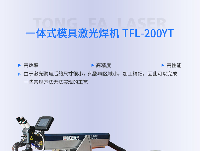 通發(fā)激光一體式模具激光焊機(jī)TFL-200YT/TFL-400YT是一款多種功能融合一體的新型模具激光焊接機(jī),針對(duì)特大型塑料模具激光焊、中型注塑模具激光燒焊、小型塑膠模具激光補(bǔ)焊、壓鑄模激光補(bǔ)焊具等各類模具可實(shí)現(xiàn)超精密修復(fù),幫您解決大型汽車模具修復(fù)難題,不需要模具移動(dòng),電動(dòng)工作臺(tái)與立體旋轉(zhuǎn)激光頭完美結(jié)合,操作桿控制運(yùn)動(dòng)移動(dòng)實(shí)現(xiàn)輕松激光修復(fù)大型模具,同時(shí)也保留了傳統(tǒng)手動(dòng)工作臺(tái)超精密修復(fù)模具功能。
